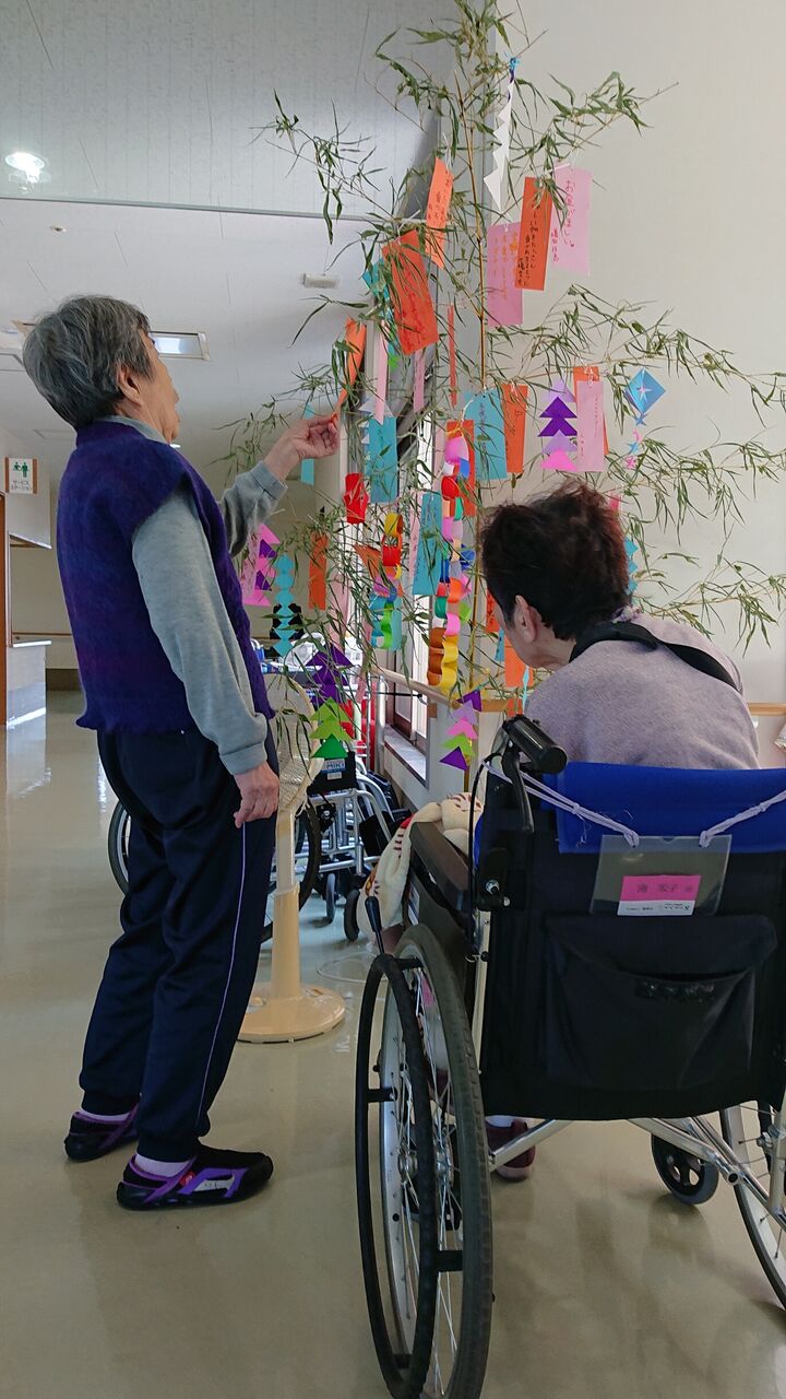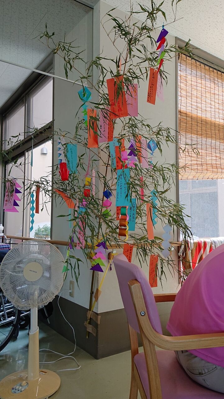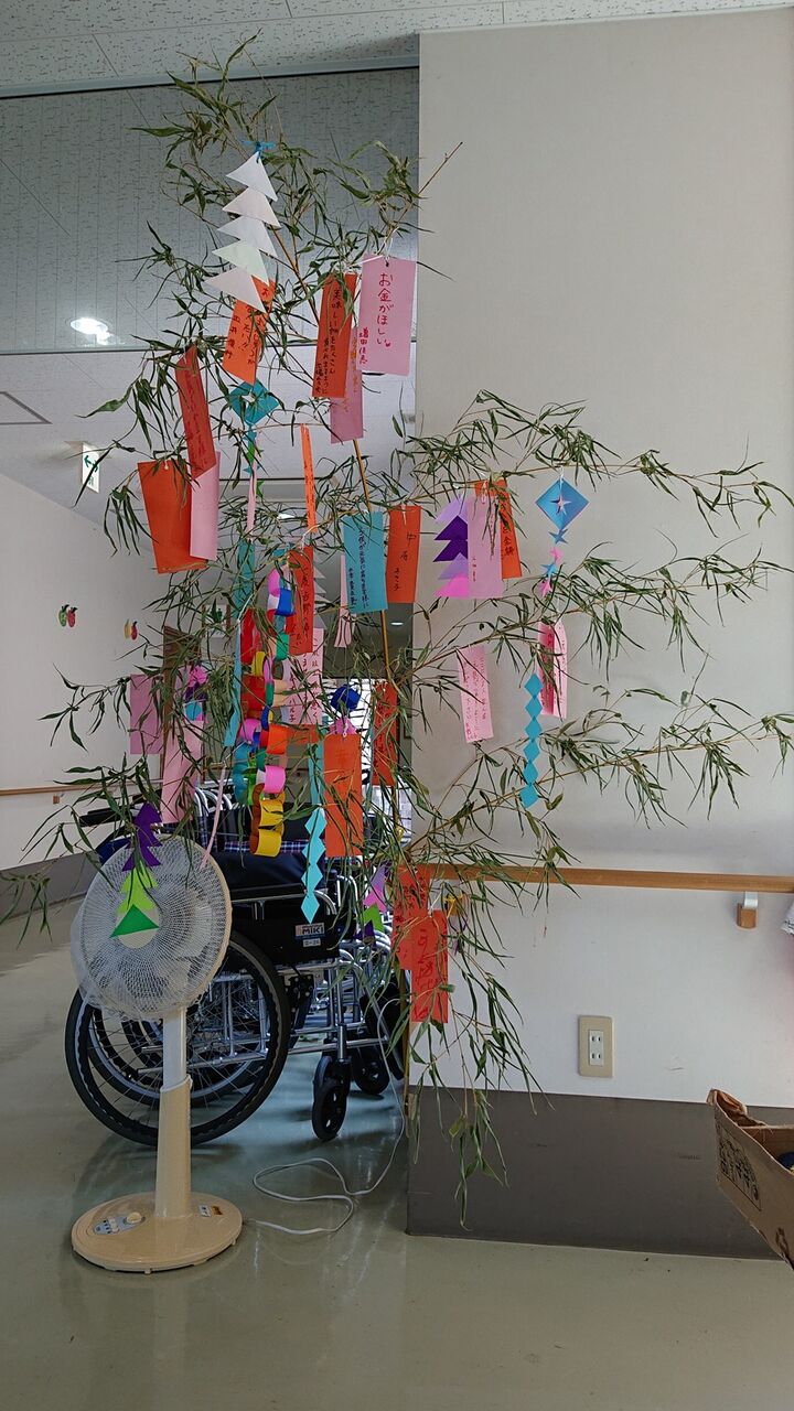 もうすぐ七夕ですので、笹に利用者様の願い事を書いていただいた短冊と飾り付けをしました。