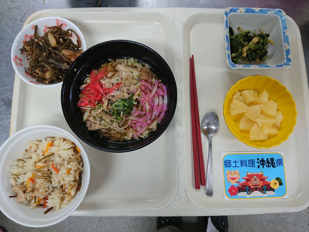 沖縄そば、ジューシー(沖縄炊き込みご飯)、クープイリチー(昆布の炒め物)